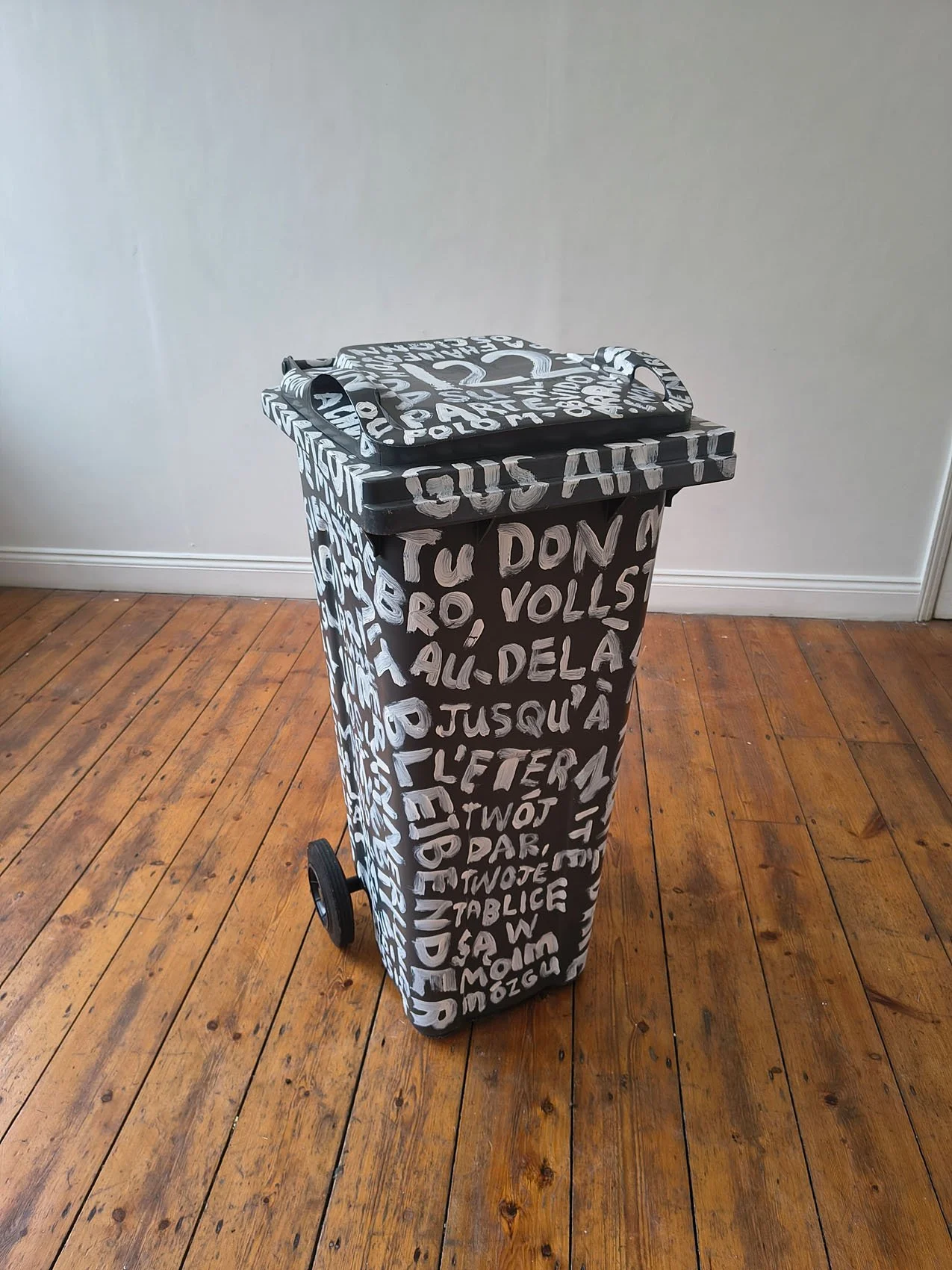 '122' is covered in words in multiple languages. For most viewers, the majority of the text remains illegible or incomprehensible. The words do all mean something, all a considered narration on a singular subject. I choose not to explain what this subject is - the point is that it remains frustratingly out-of-reach. In an age of digital noise, we are often overwhelmed by information we cannot process. '122' represents that tipping point where language stops being a tool for clarity and feels more like a barrier to insight. The wheelie bin is a mundane, functional object associated with waste. By applying hand-painted "signwriting" in various languages it reflects our daily experience: being surrounded by messages, alerts, and data that we see but don't truly "understand."